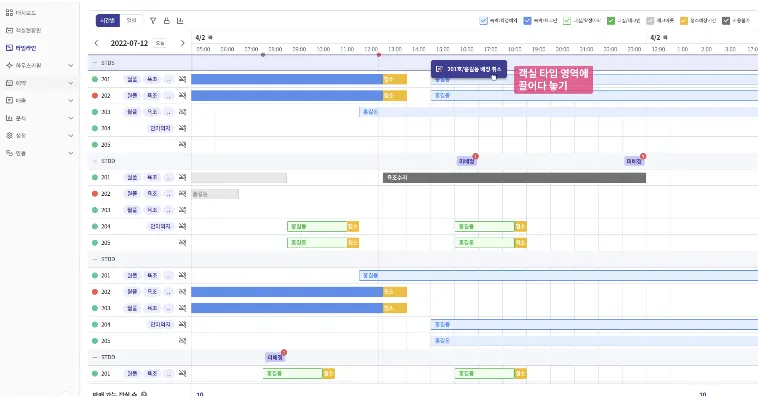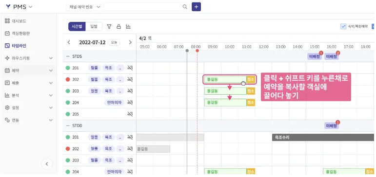 예약 블럭을 세로로 이동하여 다른 객실로 변경할 수 있습니다.