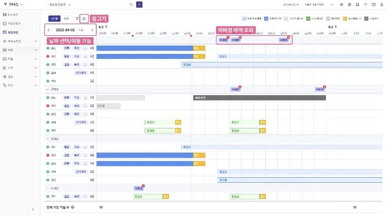 타임라인은 예약 생성 및 조회, 재고 관리가 가능한 통합 예약 관리 메뉴입니다.