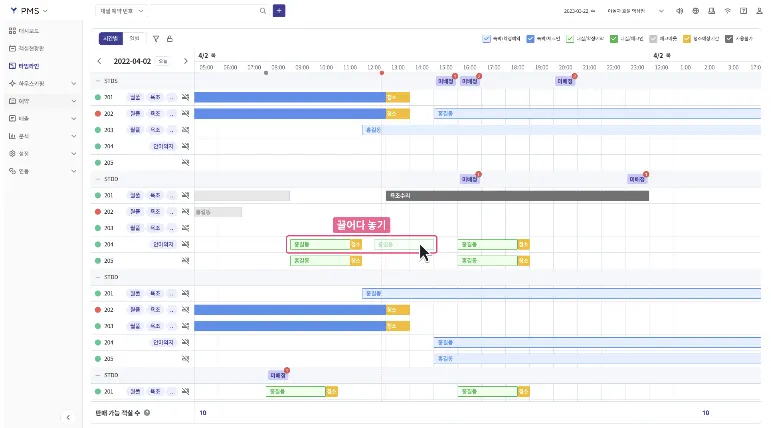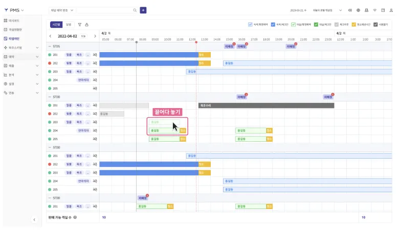 예약 블럭을 가로로 이동하여 일정을 변경할 수 있습니다.