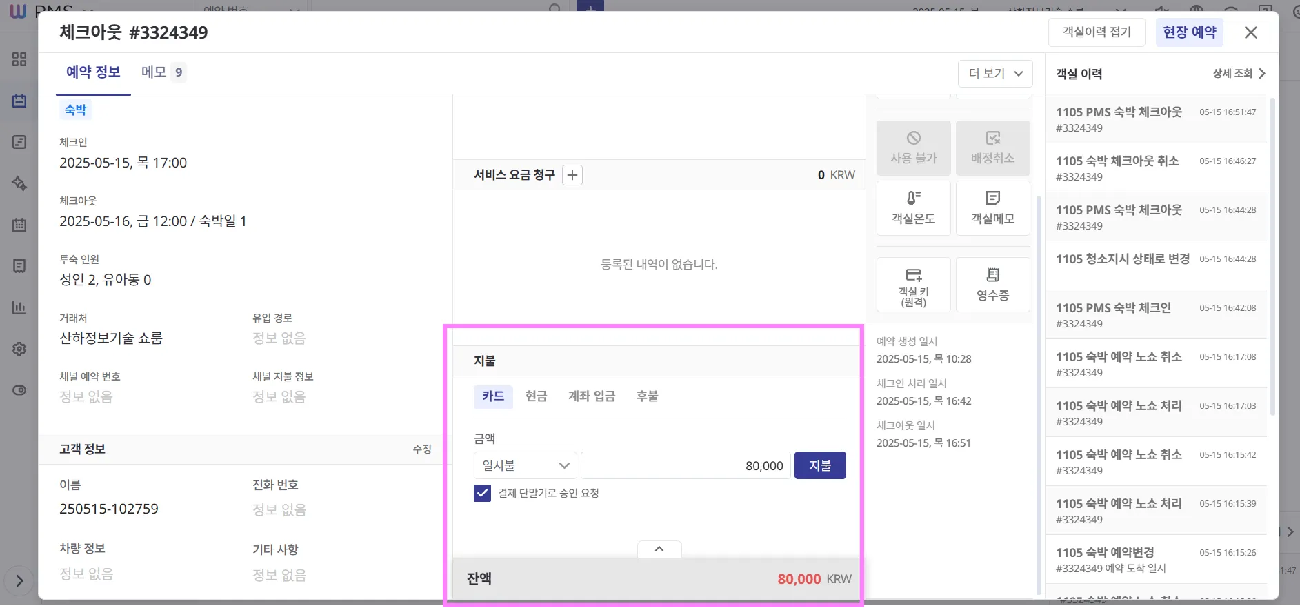 객실현황판 > 해당 객실 클릭 > 위와 같은 ‘지불’ 부분