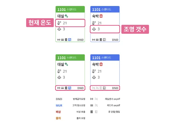 RMS 연동을 통한 객실 장치 상태 조회, 이에 따른 청소 상태를 관리할 수 있는 통합 객실 관리 메뉴입니다. 위 이미지에서 표시하는 각 아이콘들에 대한 설명을 확인해 주세요.