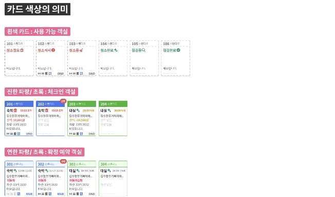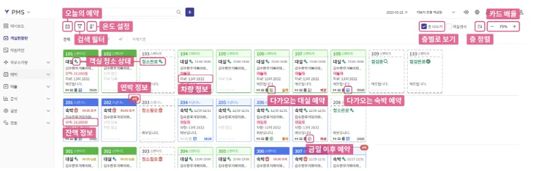 객실 블럭의 색상과 표시되는 아이콘, 일정을 통해 객실의 사용 현황을 파악할 수 있습니다.