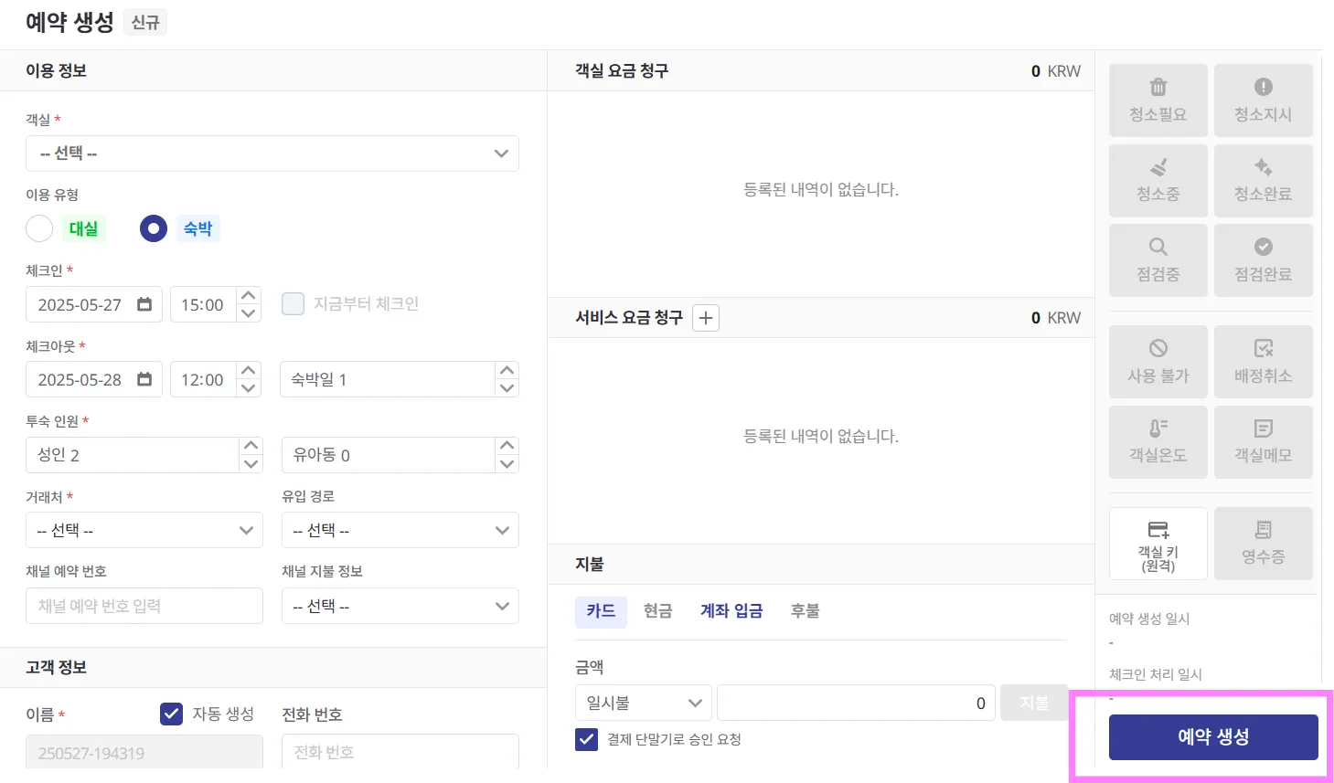 되므로 필요한 항목만 수정 후 [예약 생성] 또는 [체크인]을 클릭하면 예약이 완료됩니다.