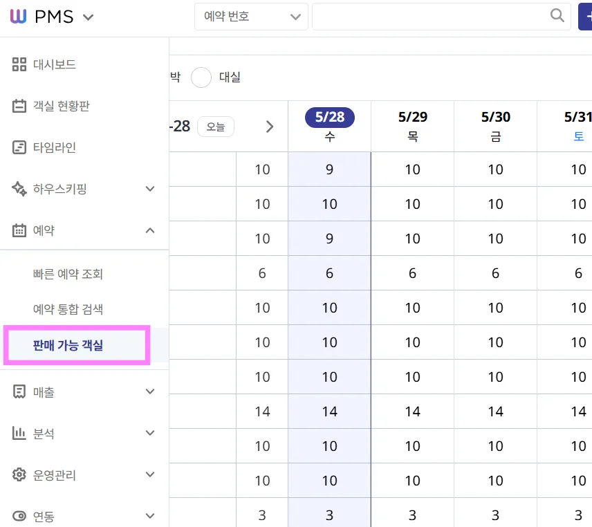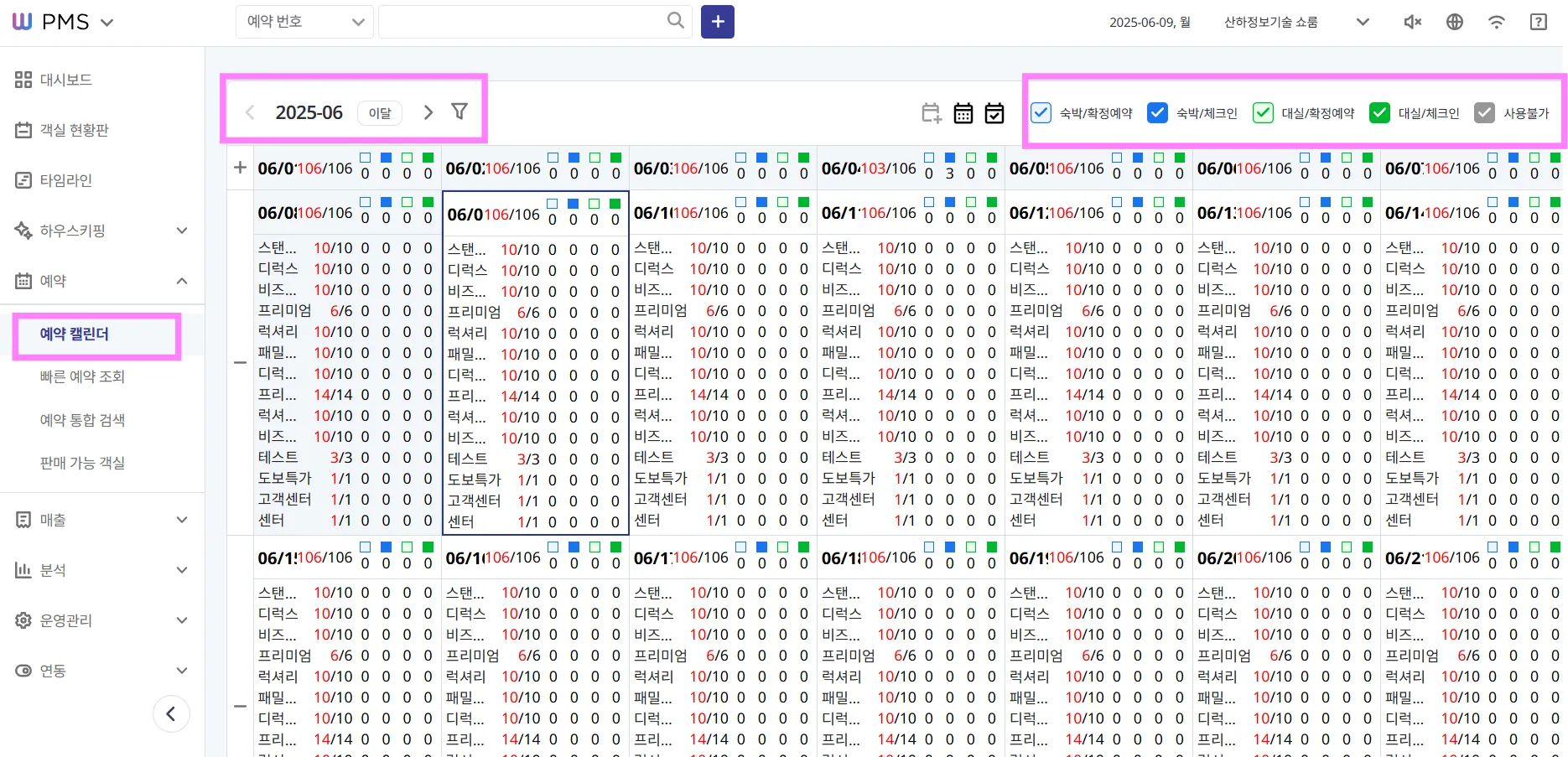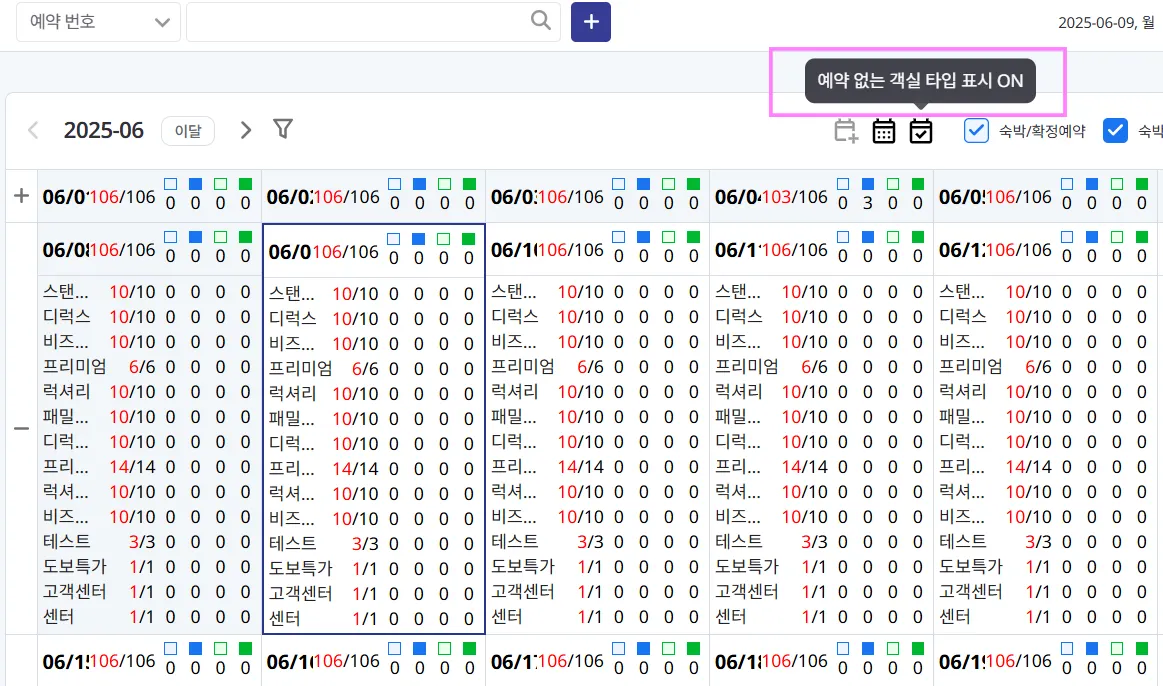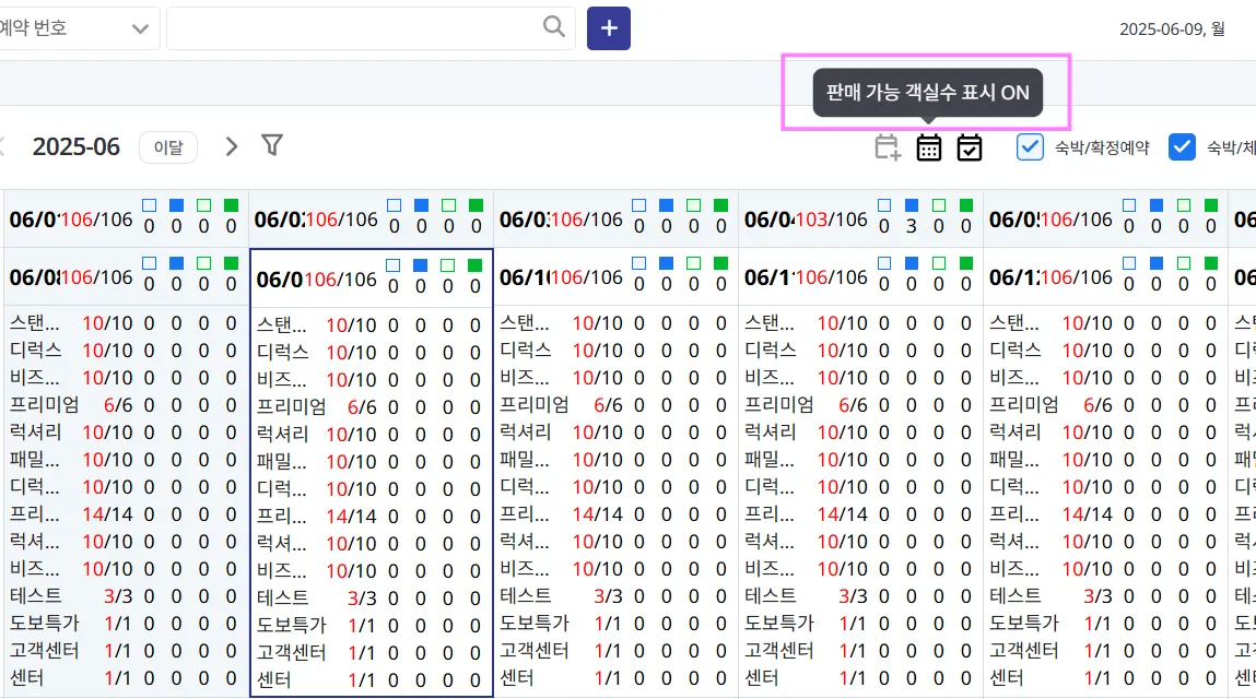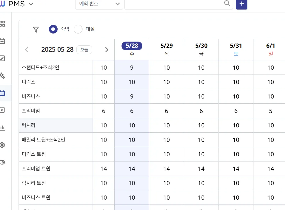 각 객실 유형과 날짜별로 남아있는 객실 수를 한눈에 확인할 수 있어,