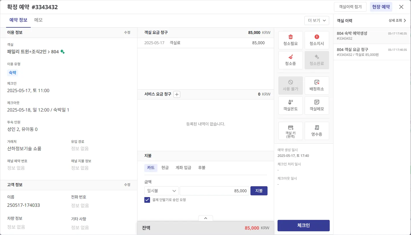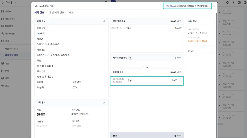 처리 정보 영역을 통해 예약 생성, 체크인/체크아웃, 노 쇼, 예약 취소 등의 예약의 처리 시간을 확인할 수 있습니다.