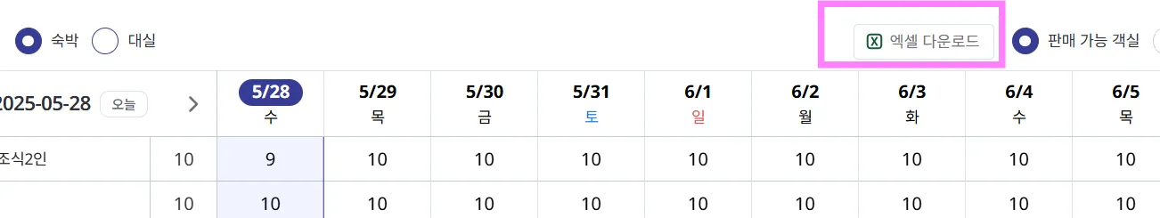 이 표 형식으로 정리되어 있어, 특정 날짜에 여유 객실이 있는지 빠르게 파악할 수 있습니다.
