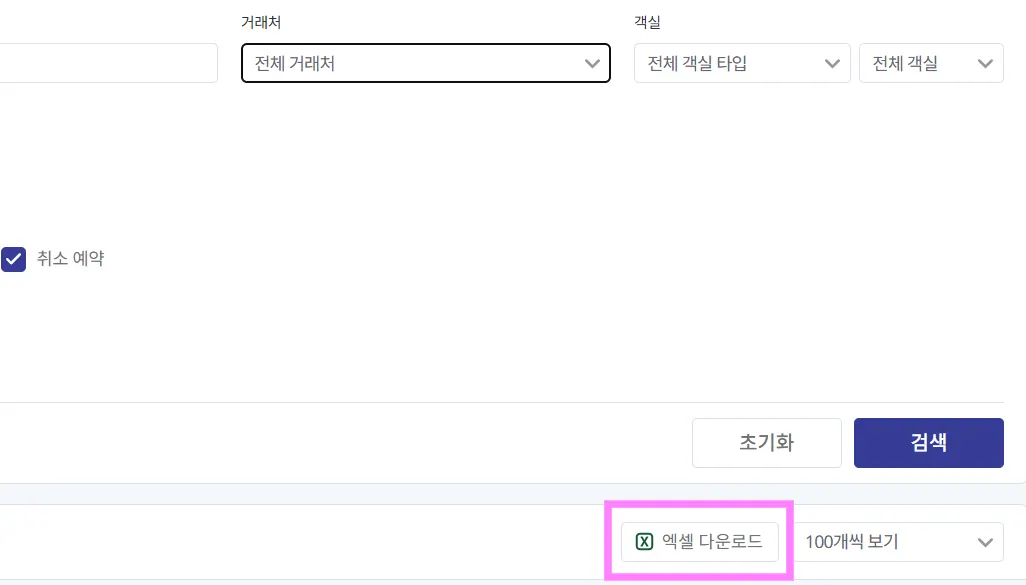 예약 통합검색 화면 우측에서, 엑셀파일로 다운로드 가능합니다.