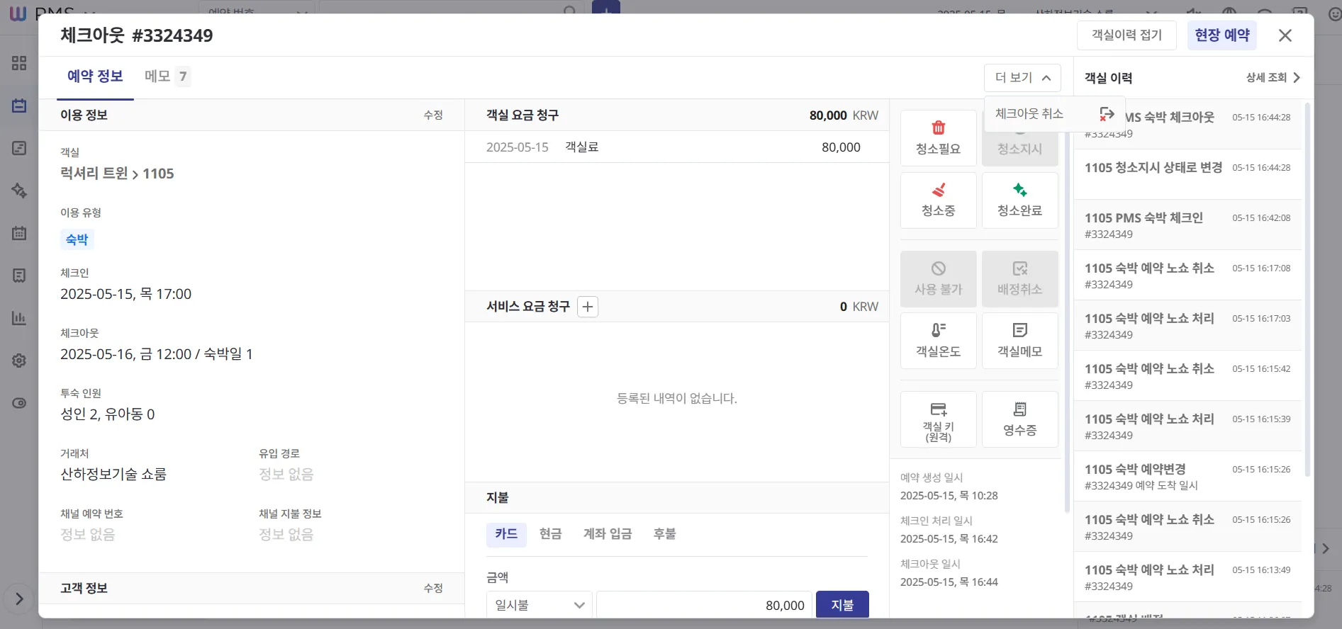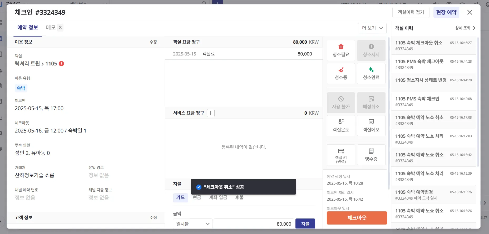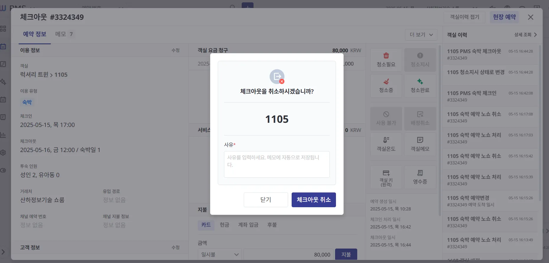 투숙 중인 고객이 퇴실할 경우, PMS에서도 반드시 체크아웃 처리를 진행해 주세요.