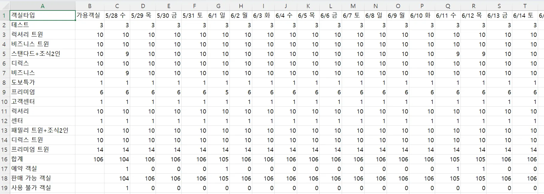 날짜별 객실 잔여 수량이 표 형식으로 정리되어 있어, 특정 날짜에 여유 객실이 있는지 빠르게 파악할 수 있습니다.