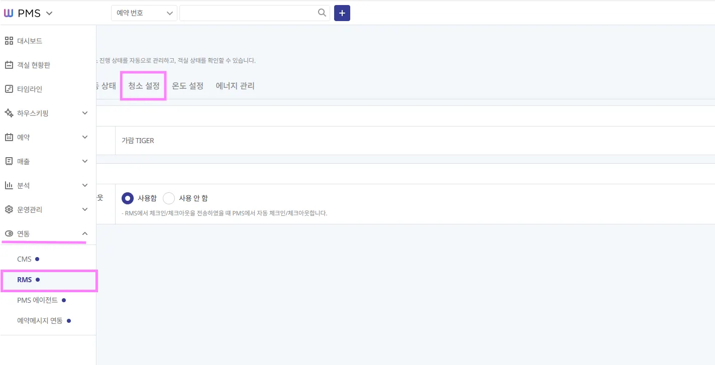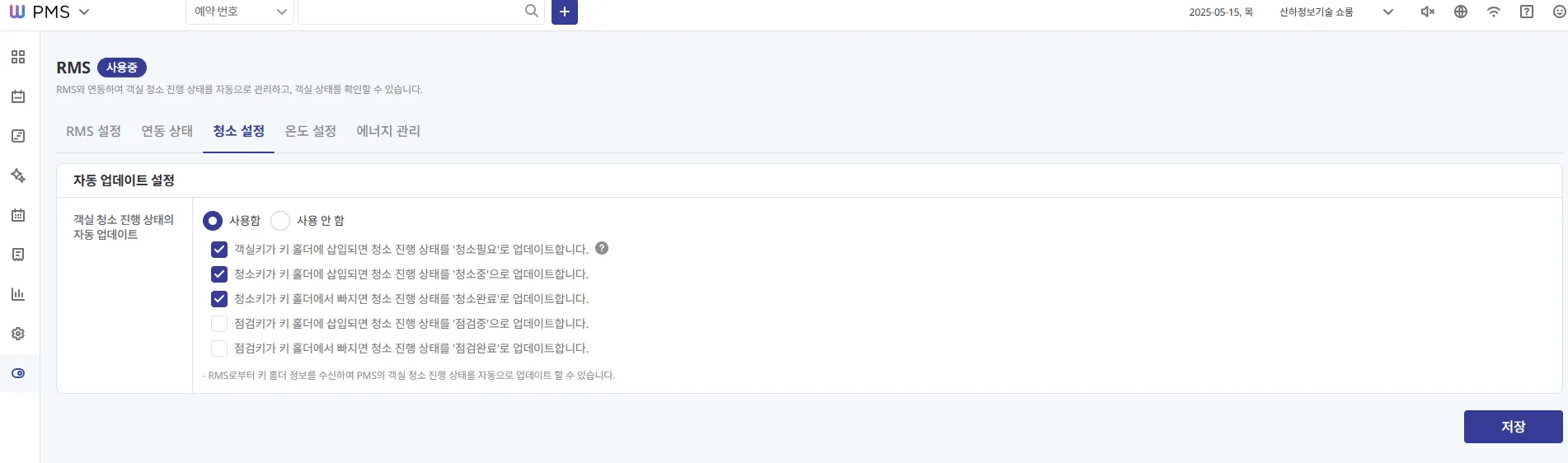 RMS 연동에 따른 청소 진행 상태 자동 업데이트에서 ‘사용함’을 선택해주세요.