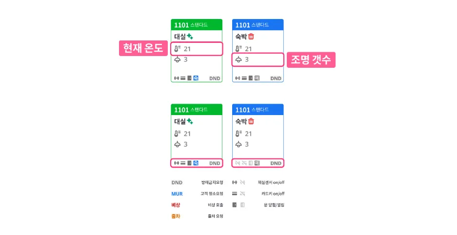 청소필요 : 체크인 여부 관계없이 객실에 고객키가 꽂히면 청소 필요 상태로 변경됩니다.