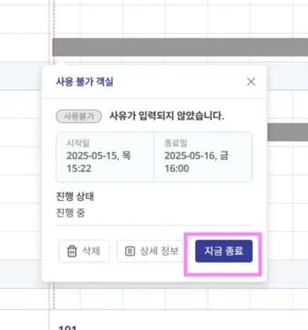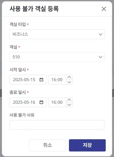 설정된 기간 동안 해당 객실 배정 및 체크인 불가
