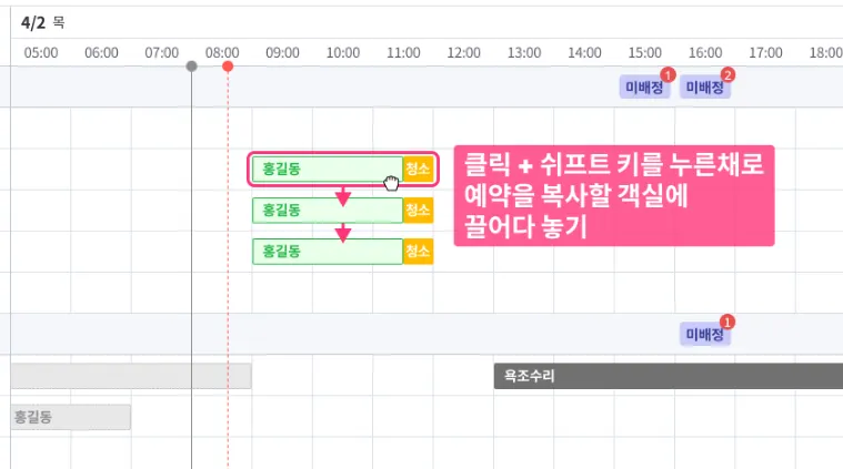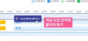해당 예약 블럭을 클릭하여 객실 타입 영역으로 드래그앤드랍
