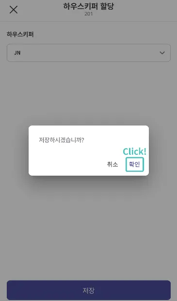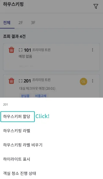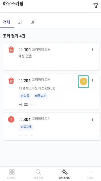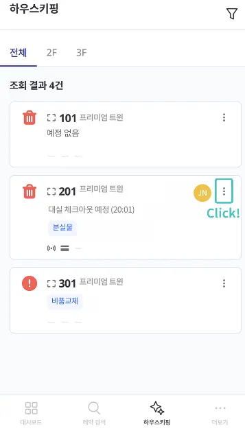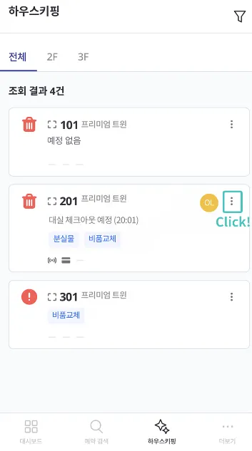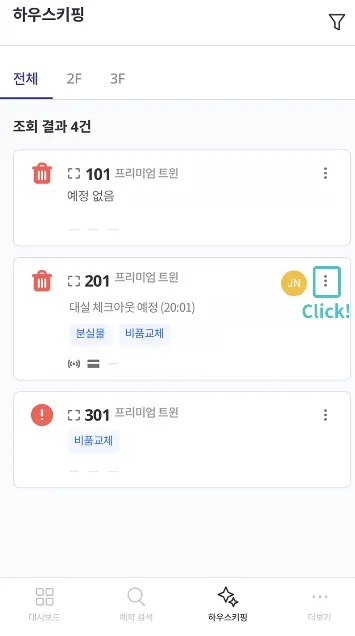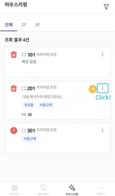 왼쪽 예시 이미지와 같이 더 보기 버튼을 클릭하여 '하우스키퍼 할당'을 클릭해 주세요. 할당하고자 하는 하우스키퍼를 선택한 다음 저장하여 변경 및 새로 지정된 하우스키퍼 정보를 확인할 수 있습니다.