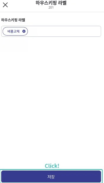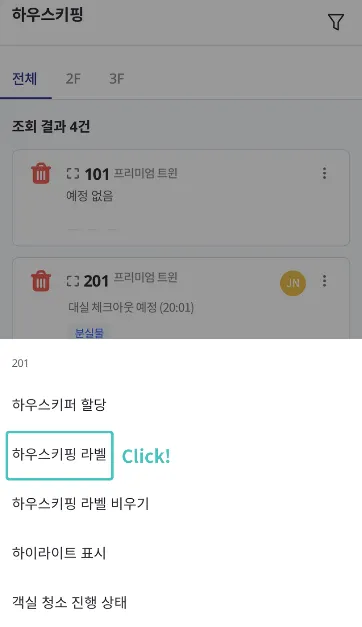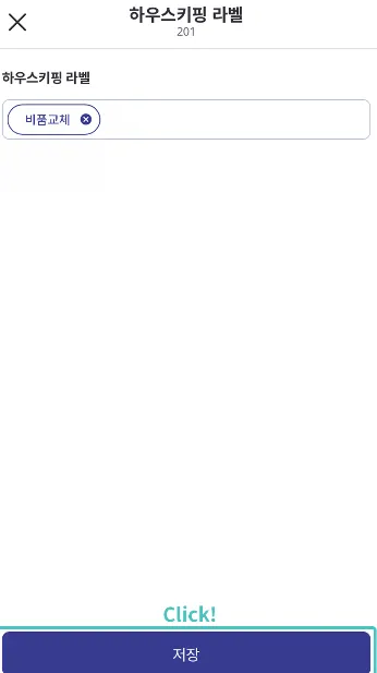 왼쪽 예시 이미지와 같이 더 보기 버튼을 클릭하여 '하우스키핑 라벨 등록' 버튼을 클릭해 주세요. 간단한 키워드로 내용을 등록한 다음 저장하여 입력된 라벨 내용을 확인할 수 있습니다.