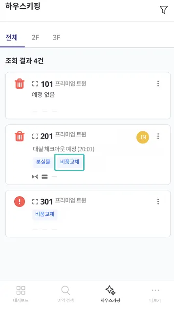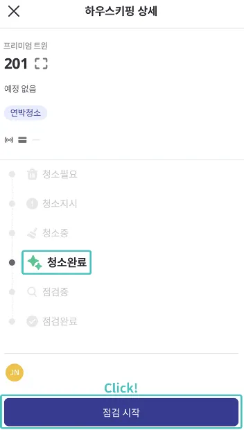 점검 절차가 있는 숙소에서는 '점검중', '점검 완료' 상태까지 관리할 수 있습니다.