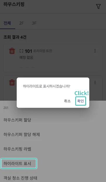 예를 들어, '빠른 청소가 필요한 객실'에 사용하기로 한 경우, 프론트에서 빠른 청소가 필요한 객실에 하이라이트 효과를 표시하고, 하우스키퍼는 PMS 모바일을 통해 하이라이트 객실을 확인한 즉시 청소를 진행할 수 있도록 규정할 수 있습니다.