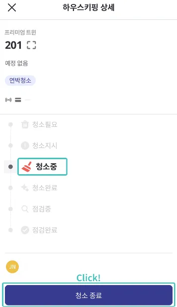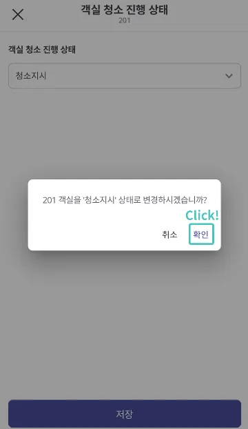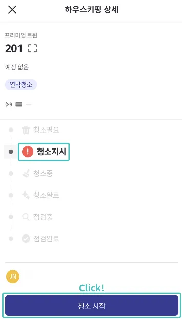'청소 지시' 상태에서 [청소 시작] 버튼을 누르면 '청소중' 으로 변경되고, '청소중' 상태에서 [청소 종료] 버튼을 누르면 '청소 완료' 상태로 변경됩니다.