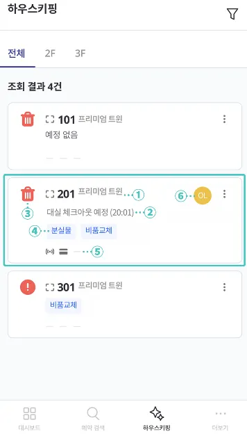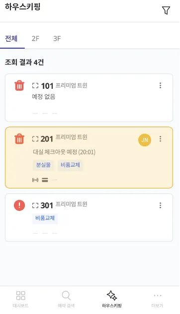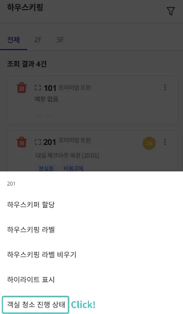 프론트에서 현재의 청소 상태 구분을 위해 변경하는 게 아닌, 하우스키퍼가 본인에게 할당된 객실의 청소를 진행하는 중이라면 아래 '객실 카드 상세' 항목을 참고해 주세요.