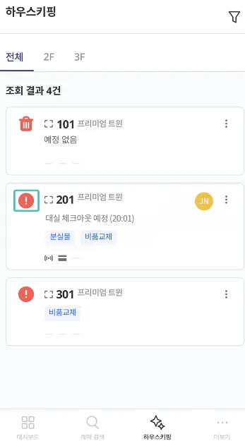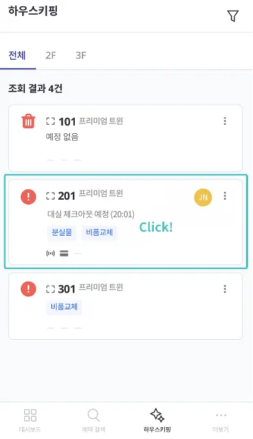 각 객실 카드를 클릭하면 객실 정보 조회와 함께 청소 상태를 관리할 수 있습니다.