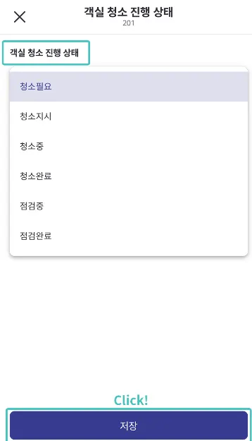 객실의 청소 진행 상태를 변경합니다. RMS(객실 관리 시스템)와 연동하지 않거나 연동 중 장치 고장, 일시적인 연동 장애 등으로 인해 수동 변경이 필요한 경우 사용할 수 있습니다.