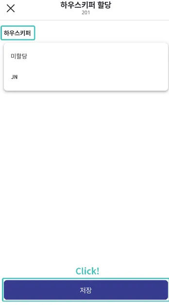 객실별로 청소할 하우스키퍼를 설정합니다. 미 할당 상태인 객실, 또는 이미 할당된 객실에 다른 사람으로 변경할 경우 사용할 수 있습니다.
