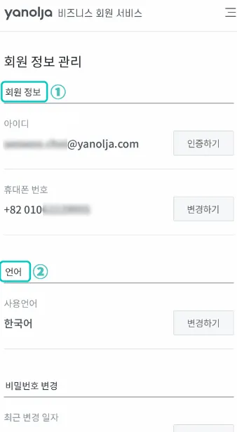 사용 중인 계정에 대한 비밀번호 변경, 언어 설정 등의 사용자 정보를 변경할 수 있습니다. [계정 관리] 버튼을 클릭하여 본인의 계정 정보를 확인한 다음 [회원 정보 관리] 버튼을 클릭해 주세요.