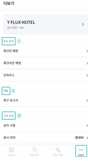 현재 영업일에 해당하는 체크인 예정, 체크아웃 예정, 인하우스(재실) 목록을 빠르게 조회할 수 있습니다.