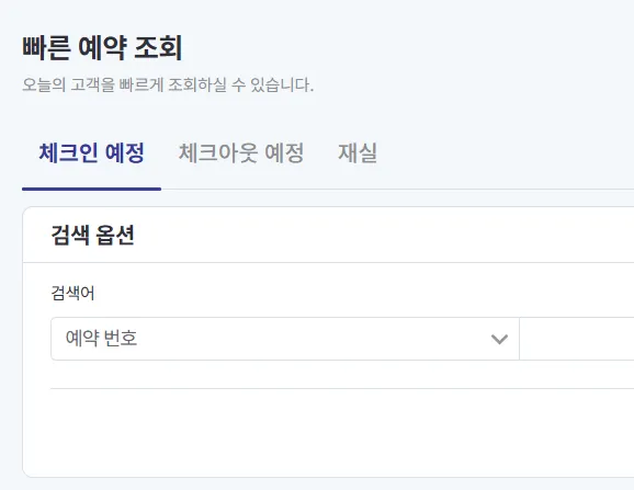다른 조건없이 현재 영업일에 해당하는 체크인 예정, 투숙 중, 체크아웃 예정 객실 목록을 빠르게 조회할 수 있습니다.