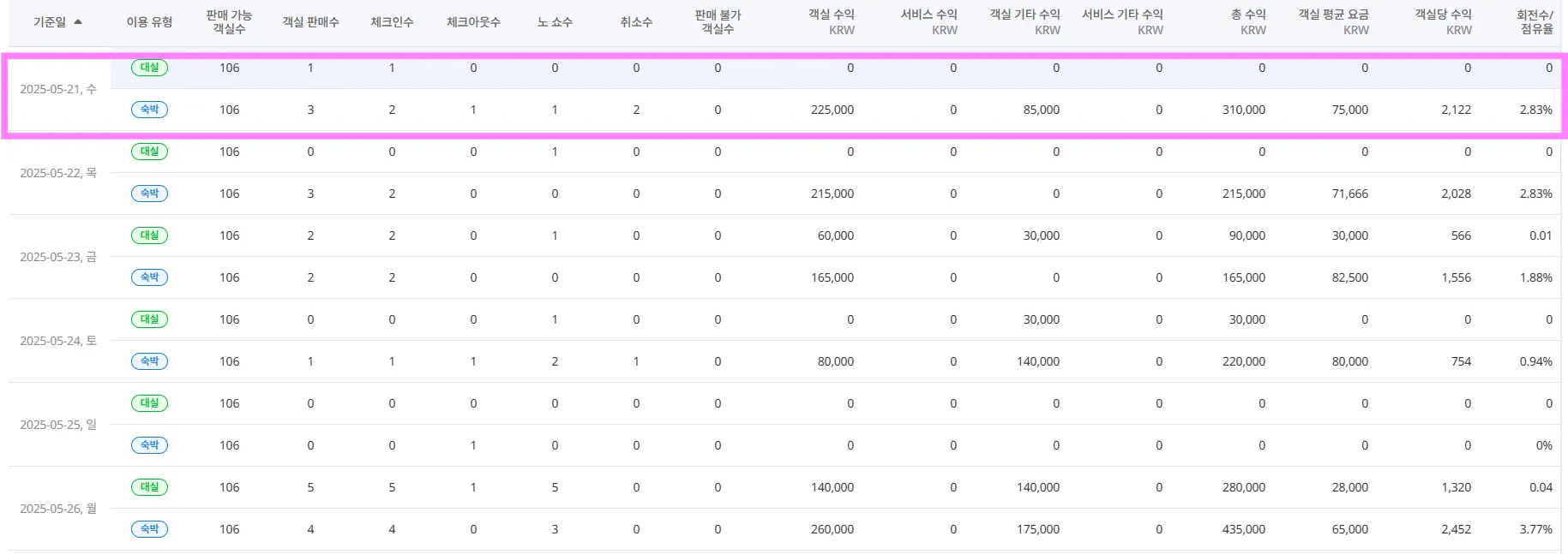 → 대실 1건, 숙박 1건으로 각각 따로 잡힙니다.