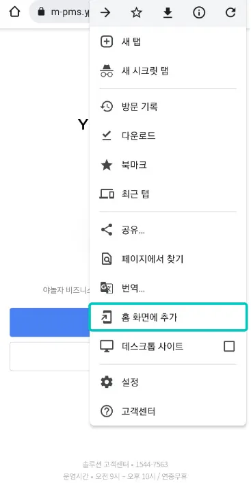 메뉴 목록에서 ‘홈 화면에 추가’를 클릭합니다.