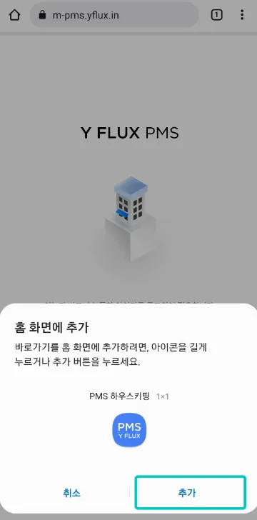 ‘홈 화면에 추가’ 팝업창이 뜨면 우측 하단 ‘추가’ 버튼을 클릭합니다.
